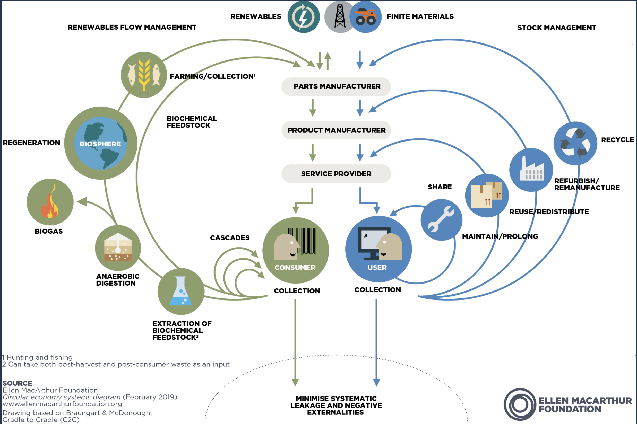 The grande dame of the circular economy is British luminary and world-class sailor, Ellen MacArthur (and yes, she really is knighted as a dame). Her eponymous foundation, the Ellen MacArthur Foundation, created a graphic explaining the various levels of circularity (see image below).